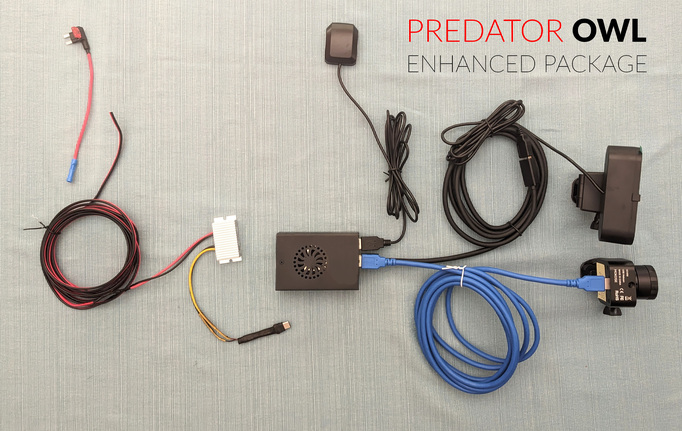 The exact contents of each kit will vary based on the package tier selected, hardware availability, and custom requests, but a typical Predator Owl kit includes everything you need to install a fully custom dash-cam (minus tools like wire strippers and crimpers).